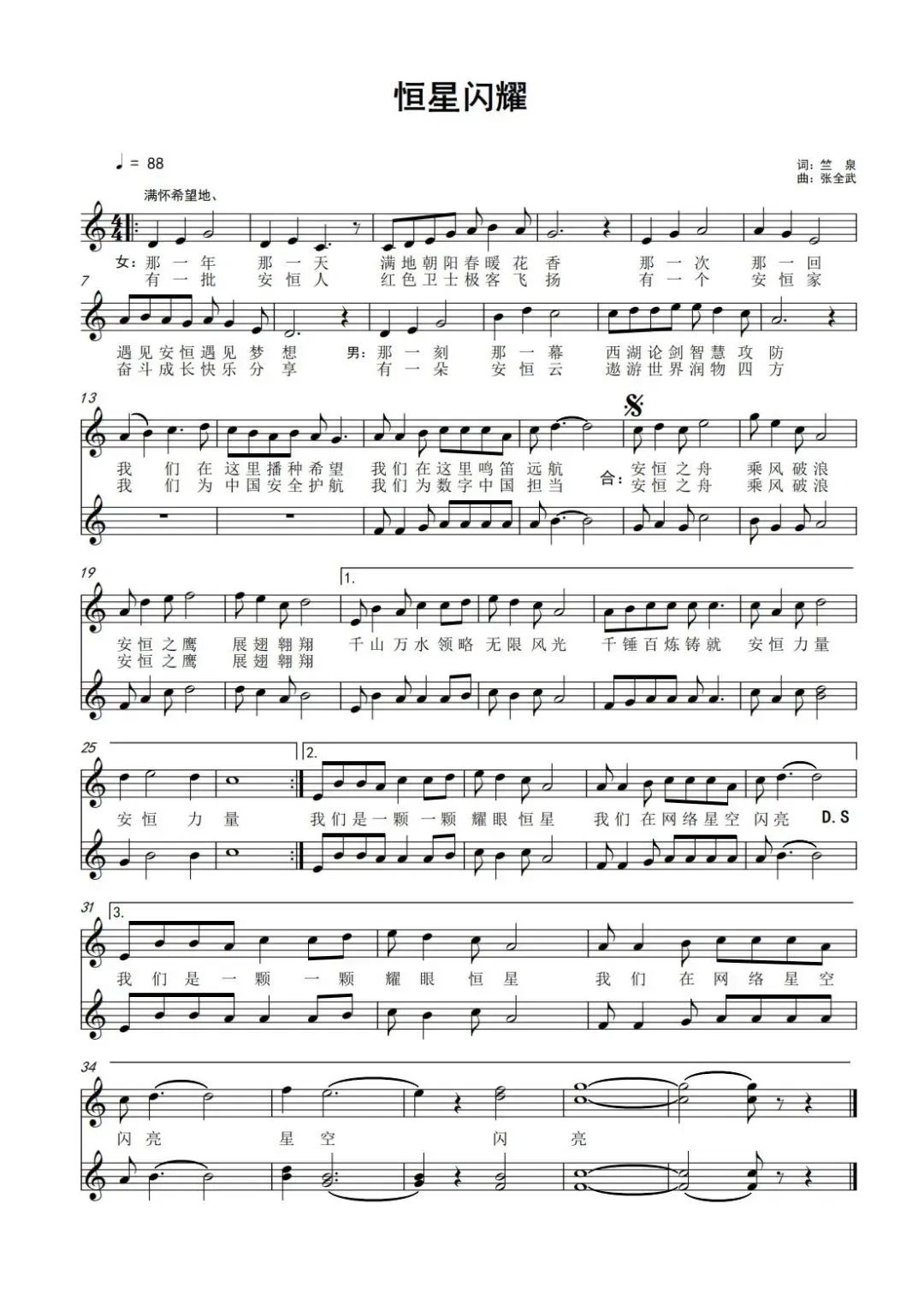 早在两年前,你们的董事长范渊先生就和我说,要在安恒信息15周年之际推出一首司歌,并希望我来填词。这是范渊先生对企业文化发展的深谋远虑。在歌词创作过程中,我回顾了安恒信息的发展历程,范渊先生艰苦创业的初心、经营企业的智慧、回报社会的情怀。正是在他带领下,安恒信息如今成长为网络信息安全领域的领军者之一。这些年来,安恒信息参与了近乎全部国家重大网络安保,实现了零失误,为中国安全护航,为数字中国担当。如果把数字世界比喻为浩瀚的宇宙,那么安恒信息就是一颗闪耀的恒星,不断发光发热,遨游宇宙星空。安恒人在千锤百炼中造就了自己独特精神文化。我在歌词中写到,“我们是一颗耀眼恒星,我们在网络星空闪亮”。希望安恒信息在数字安全星空里永远闪烁光彩夺目的辉煌。