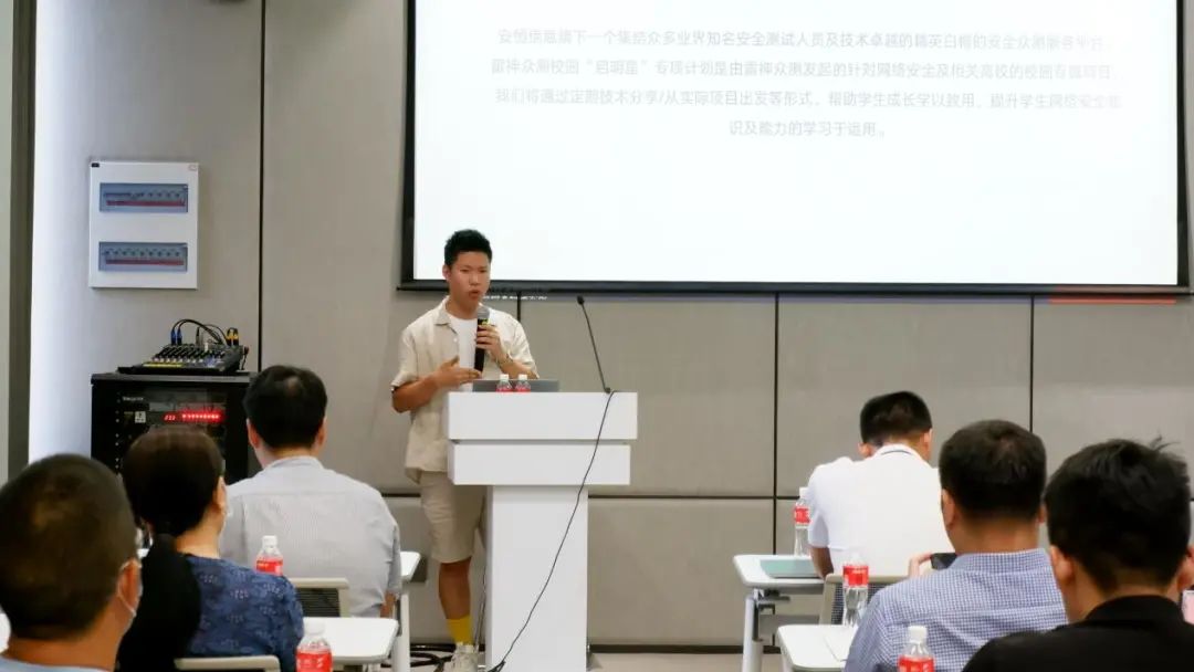安恒信息安全研究员、目前雷神众测总排名第一的Poc Sir为各高校介绍安恒信息旗下集结了众多业界知名安全测试人员及技术卓越的精英白帽的安全众测服务平台----雷神众测,通过平台发起的雷神众测校园“启明星”专项计划,希望能利用定期技术分享/从实际项目出发等形式,帮助学生成长学以致用,提升学生网络安全知识及能力的学习于运用。