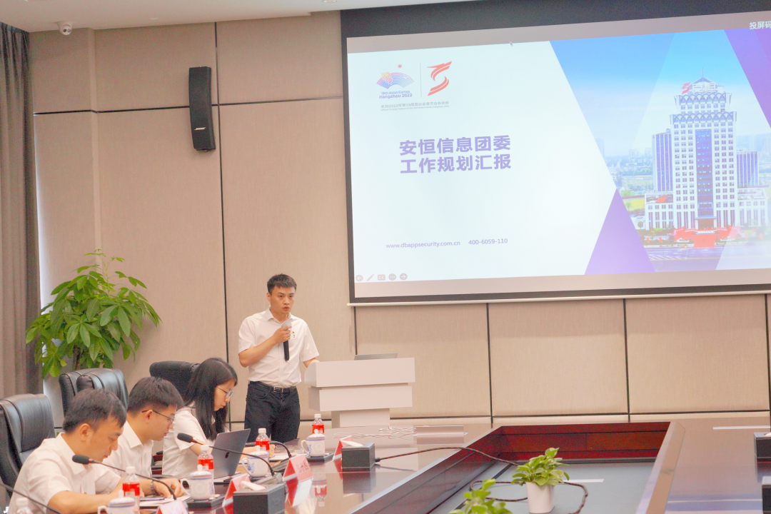 安恒信息团委书记王欣汇报了安恒团委的工作规划。王欣表示,目前公司内的青年同志占比很高,具有朝气乐观、个性自我、自信创新等特点,在公司党委和上级团组织的坚强领导下,围绕着服务于青年人才为核心,不断发现青年人才并赋能青年人才,通过荣誉褒奖与先进事迹宣传方式去鼓舞更多青年人才。