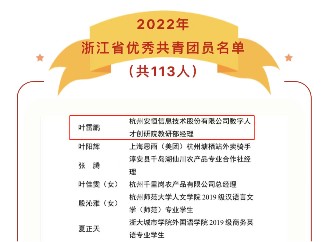 奋斗正青春,奋进正当时,安恒信息青年人才步履不停。7月27日由共青团浙江省委公布了浙江“两红两优”光荣榜,安恒信息数字人才创研院教研部经理叶雷鹏荣获“浙江省优秀共青团员”称号,以务实态度和优秀工作成果展现了安恒信息青年同志的精神风貌,发挥着引领和榜样作用。
