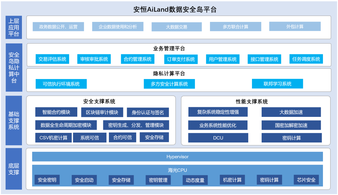 安全岛隐私计算一体机基于海光CPU的架构设计包括安全支撑系统和性能支撑系统,给安全岛隐私计算中台及上层应用平台提供了安全性,性能及稳定性上的支撑。