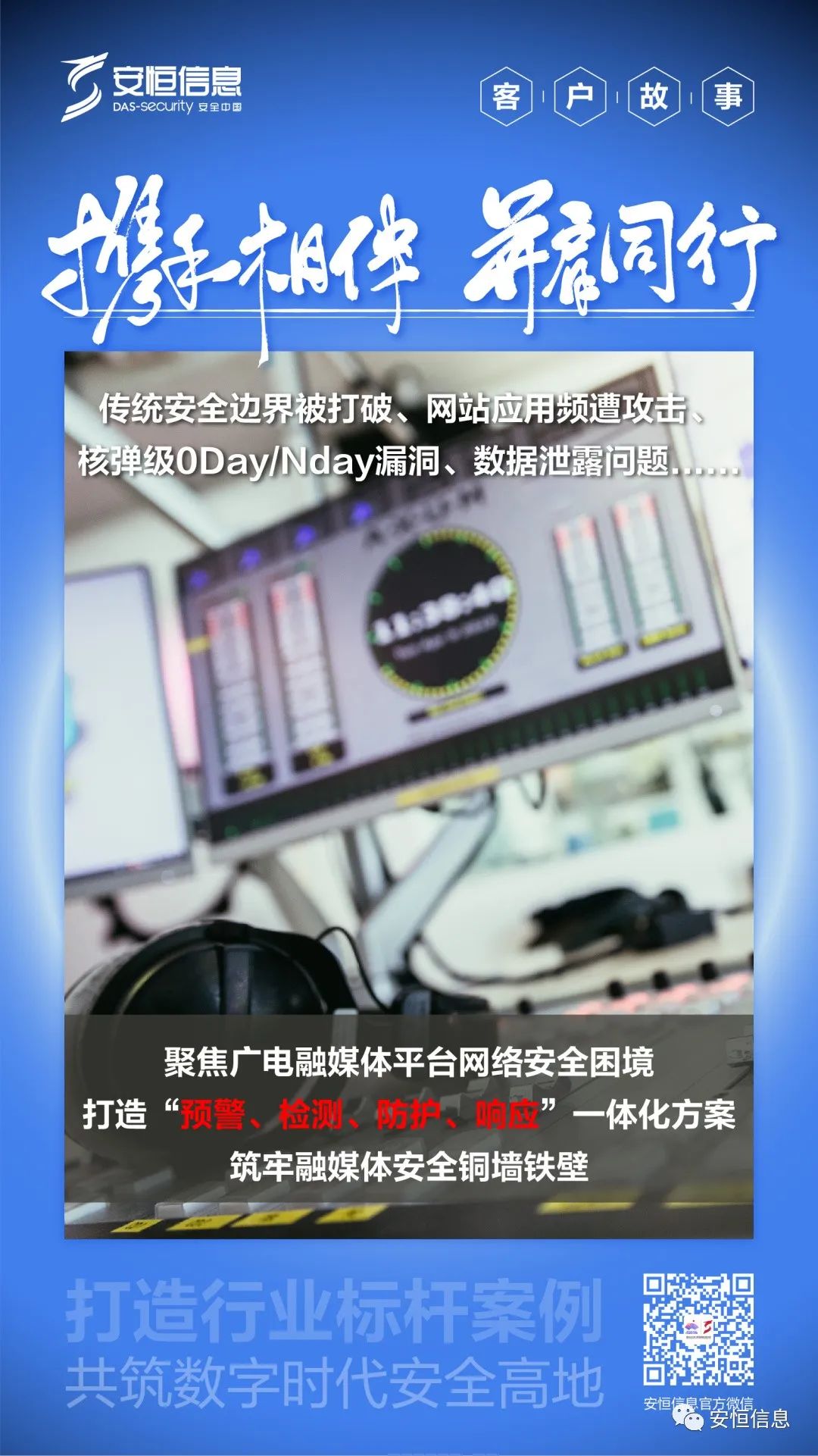 媒体是信息传播的重要窗口与渠道,在数字时代,无论是电视台制播网的运行,还是融媒体中心网络与互联网的互联互通的应用,都离不开网络安全防护的保驾护航。安恒信息作为网络安全多年的践行者与创新者,专注于多领域筑牢安全防线。未来,安恒信息也将为融媒发展提供更安全、更有利的技术支撑,为营造安全优质、稳定可靠的播出传播环境而不懈努力!