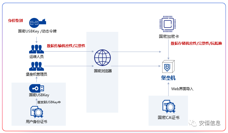 为落实国家政策,满足各行业客户对国密算法的需求,安恒堡垒机积极推进国密改造计划,在经过多轮的市场调研、技术研讨后,从多个维度完成堡垒机的国密改造。
