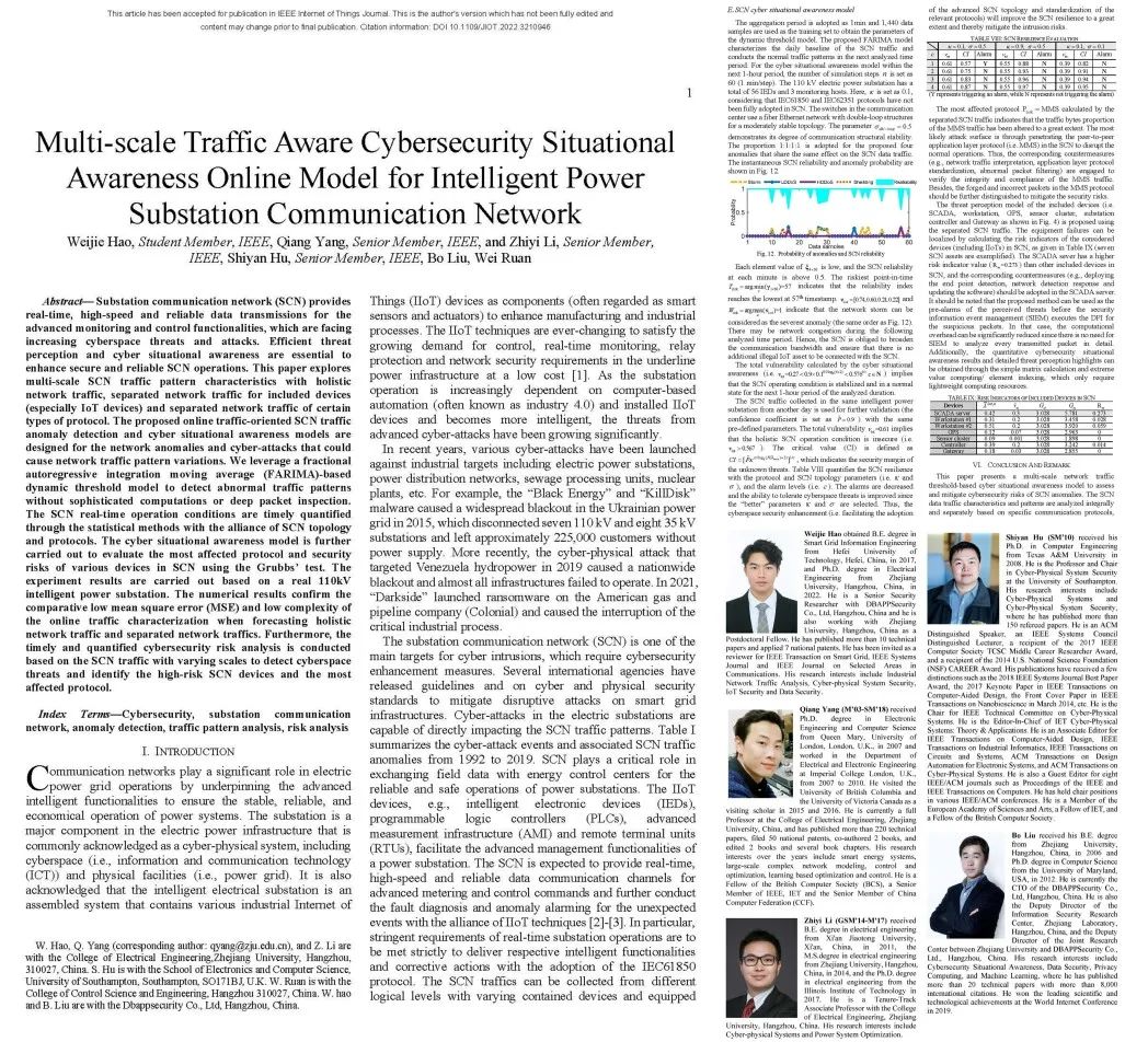 近日,由安恒信息“AiLPHA大数据实验室”郝唯杰博士主导的针对工业互联网典型场景(智能变电站通信网络)的网络安全态势感知在线架构“Multi-scale Traffic Aware Cybersecurity Situational Awareness Online Model for Intelligent Power Substation Communication Network”,被物联网领域国际顶级学术期刊《IEEE Internet of Things Journal》 收录并在线发表。