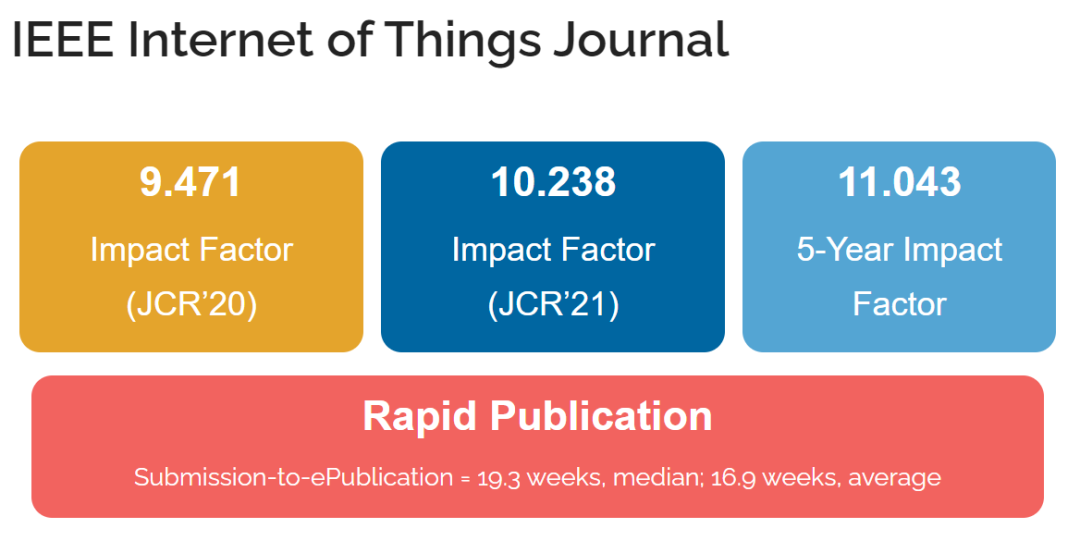 IEEE Internet of Things Journal(简称IoTJ)是国际电气与电子工程师协会(IEEE)于2014年创办的物联网领域顶级期刊。该期刊最新的影响因子高达10.238,是SCI检索期刊,同时也是中科院一区Top期刊以及JCR一区期刊。