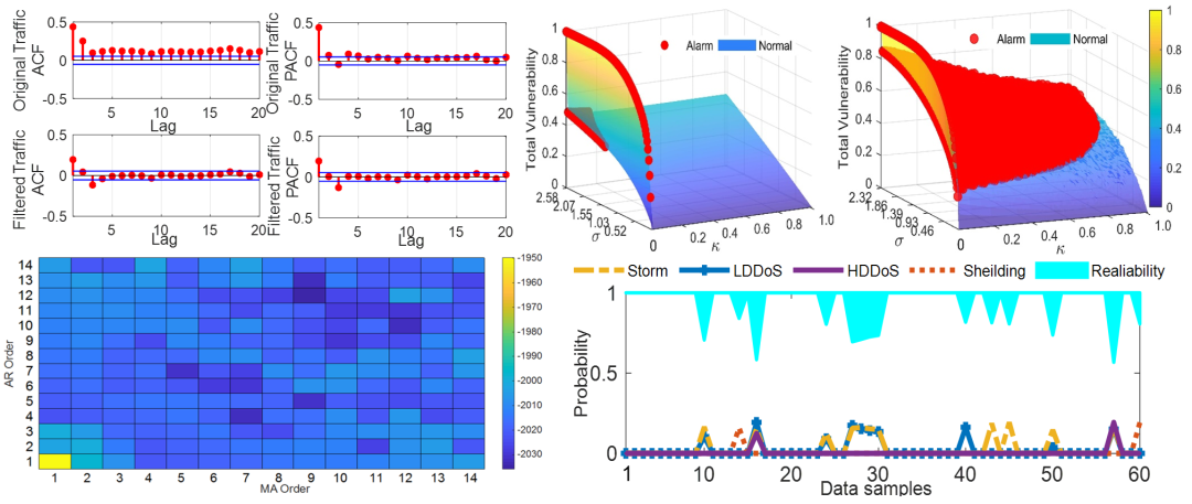 紧接着提出带有滑动时间窗口的统计学模型,对工业网络通信的关键时间序列进行建模,并实时生成下一个时间段内正常流量特征的动态阈值区间。根据实时采集的流量特征与阈值上下界,设计概率算法以量化网络风险。最终根据离群点检测得出工业网络最脆弱的运行时段和协议,以及风险程度高的网络资产。
