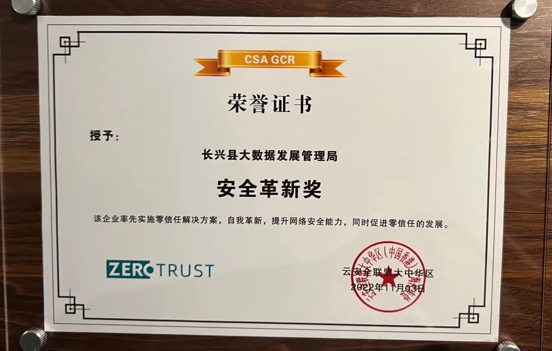 峰会当天,安恒信息湖州客户——湖州长兴县大数据荣获“安全变革奖”,用于表彰甲方企业在内部全面部署“零信任”,在安全建设过程中不断突破自我,推陈出新,反复自我迭代。寻求更新、更完善的产品或解决方案用于企业的安全建设中。