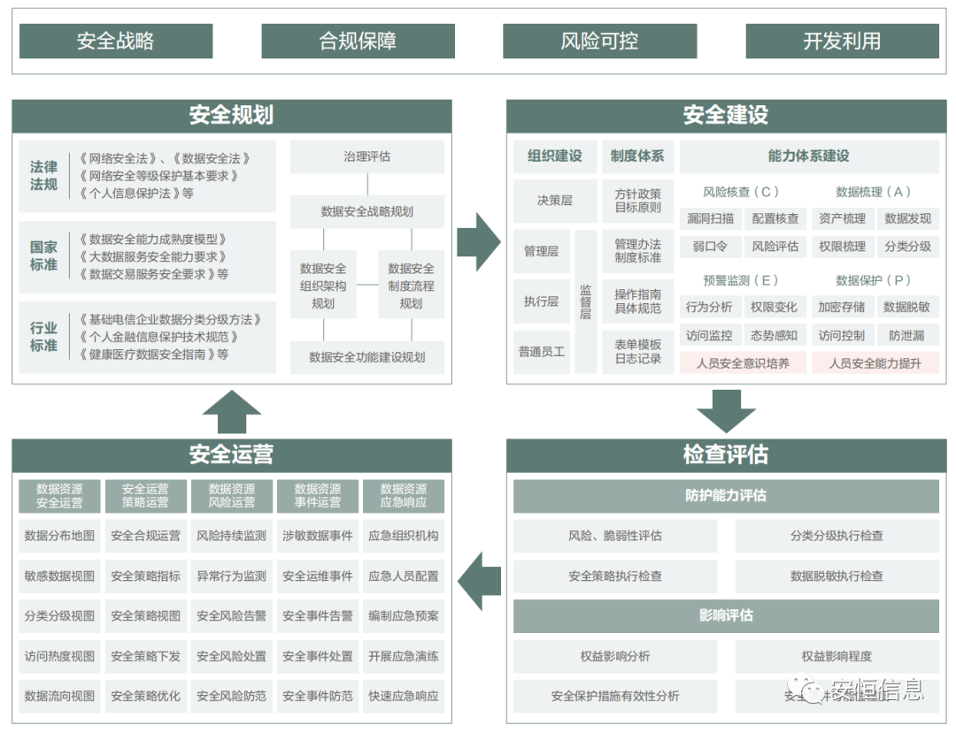 安恒信息数据安全治理体系框架包含:安全规划、安全建设、检查评估和安全运营四个方面。