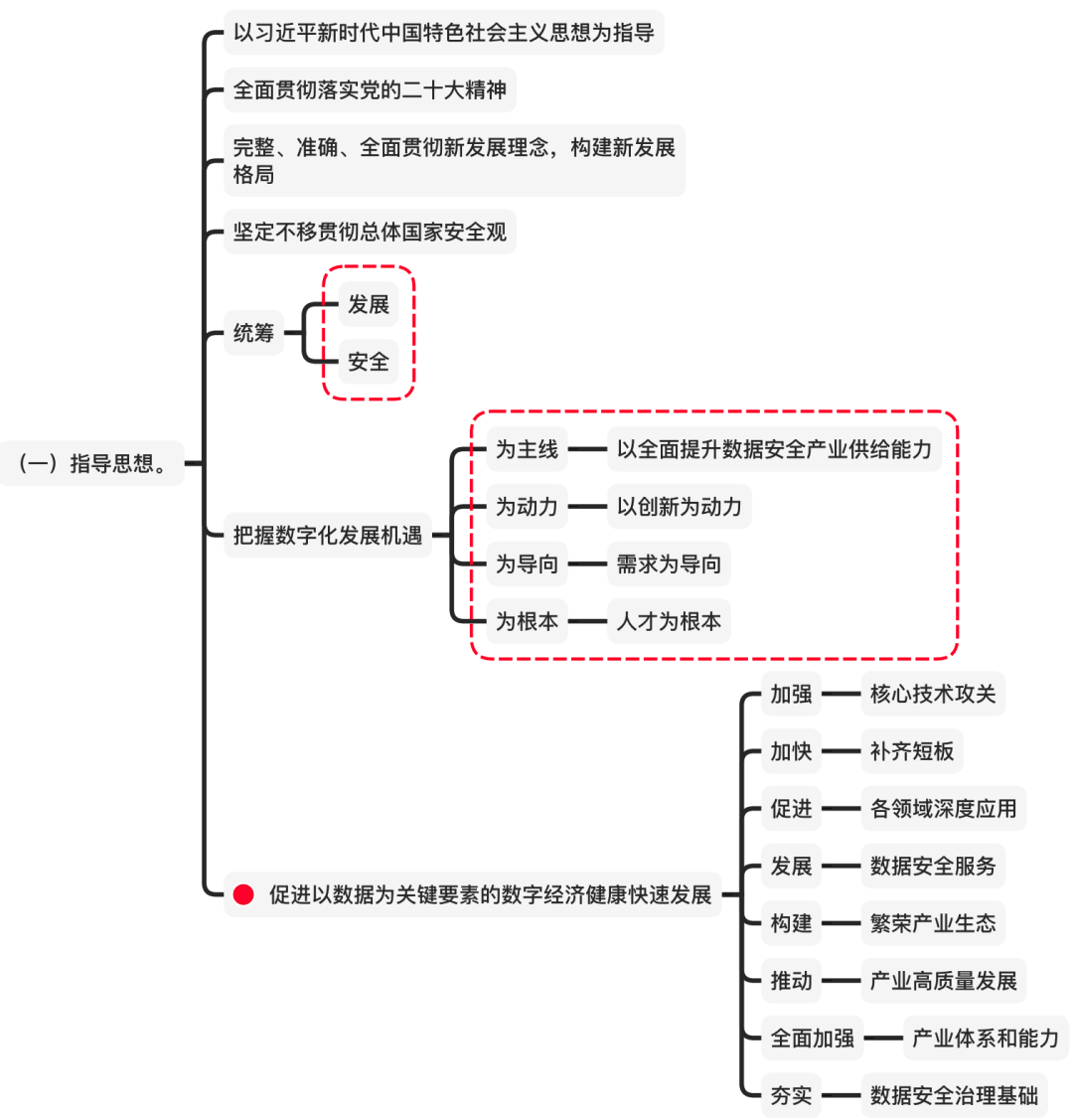 以习近平新时代中国特色社会主义思想为指导,全面贯彻落实党的二十大精神,立足新发展阶段,完整、准确、全面贯彻新发展理念,构建新发展格局,坚定不移贯彻总体国家安全观,统筹发展和安全,把握数字化发展机遇,以全面提升数据安全产业供给能力为主线,以创新为动力、需求为导向、人才为根本,加强核心技术攻关,加快补齐短板,促进各领域深度应用,发展数据安全服务,构建繁荣产业生态,推动数据安全产业高质量发展,全面加强数据安全产业体系和能力,夯实数据安全治理基础,促进以数据为关键要素的数字经济健康快速发展。