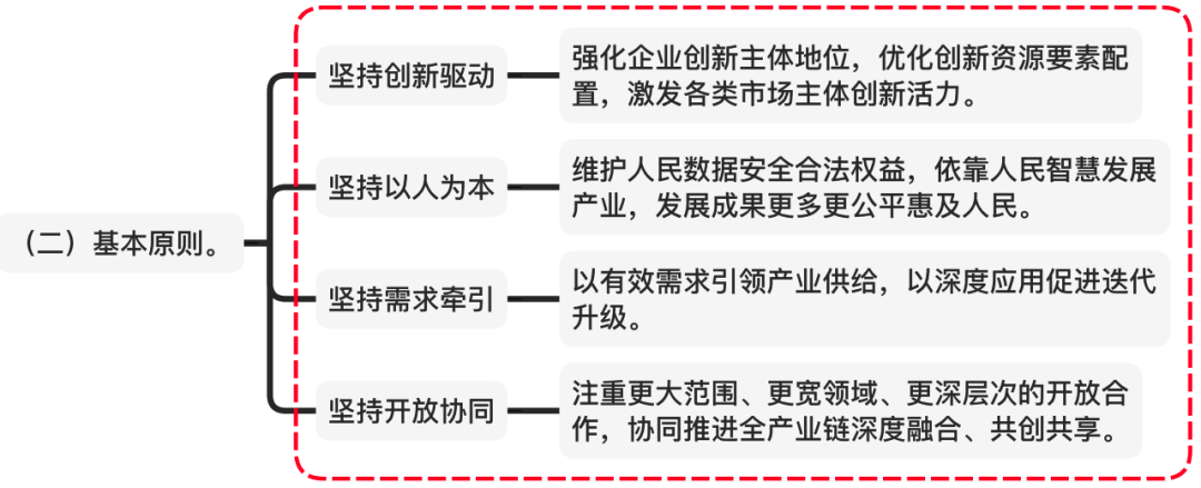 坚持创新驱动,强化企业创新主体地位,优化创新资源要素配置,激发各类市场主体创新活力。坚持以人为本,维护人民数据安全合法权益,依靠人民智慧发展产业,发展成果更多更公平惠及人民。坚持需求牵引,以有效需求引领产业供给,以深度应用促进迭代升级。坚持开放协同,注重更大范围、更宽领域、更深层次的开放合作,协同推进全产业链深度融合、共创共享。