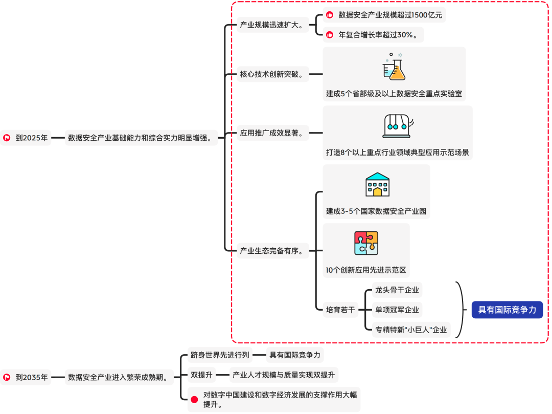 到2025年,数据安全产业基础能力和综合实力明显增强。产业生态和创新体系初步建立,标准供给结构和覆盖范围显著优化,产品和服务供给能力大幅提升,重点行业领域应用水平持续深化,人才培养体系基本形成。