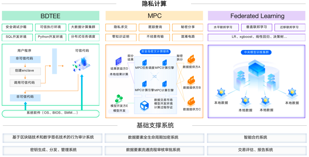 在 “推进安全多方计算、联邦学习、全同态加密等数据开发利用支撑技术的部署应用”工作方面,安恒信息数据安全岛应用TEE、联邦学习、MPC等多种前沿技术,采用自主创新的国产化设备,适配了国产操作系统,建设首创大数据环境下的可信执行环境。配合密钥管理系统和区块链审计技术,平台解决了数据共享过程中的安全、信任和隐私保护问题,构建了安全可信的大数据计算集群,保障数据安全的同时,实现原始数据“可用不可见,可用不可取”。在多地帮助大数据交易中心开展数据要素市场工作,以及政务公共数据授权运营,赋能金融普惠等。