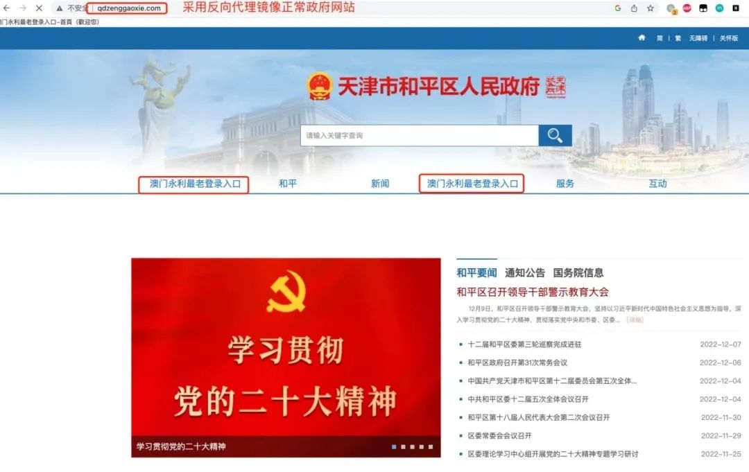 搜索引擎为了给搜索者呈现更好的搜索结果,会对网站内容打分,高质量的内容能够获得更高的seo权重,在呈现搜索结果时会在更靠前的位置。灰黑产并不会老老实实去生产内容,而是使用反向代理来镜像整个网站盗取高质量的内容。下图为灰黑产使用反向代理镜像了整个政府网站并替换了里面的链接和关键词。