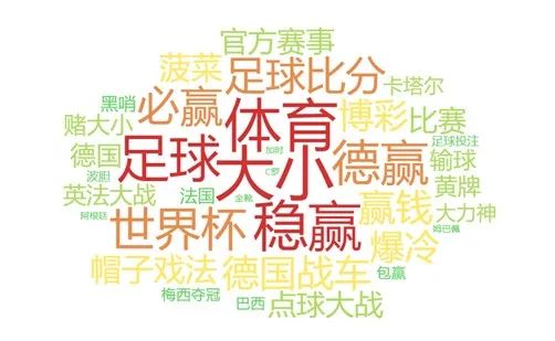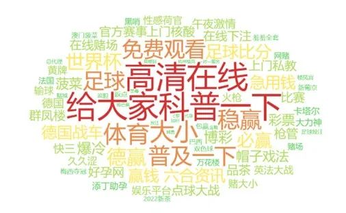 近期世界杯相关关键词出现情况进行了词频统计如图13,涉及内容主要以输赢、比分、体育以及球队,球星和部分经典比赛为主。从内容分析主要以最新的球赛消息吸引眼球,诱导用户进入博彩网站。