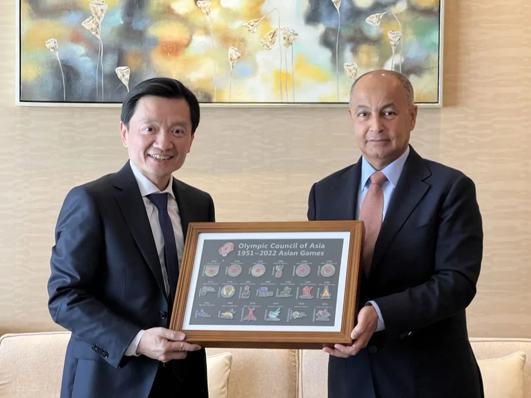 侯赛因•穆萨拉姆向范渊赠送了历届亚运会会徽套装。