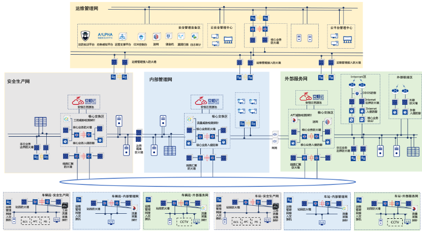 安恒云智慧城轨云安全解决方案充分结合云计算特点和城轨云专属业务要求,提供了整体的云计算安全措施。方案以等保2.0“一个中心、三重防护”的理念为基础,结合《智慧城市轨道交通信息技术架构及网络安全规范》及《城市轨道交通云平台网络安全技术规范》,基于城市轨道交通云平台网络安全的总体架构、安全防护纵深体系、各个环节的安全技术要求、云上应用系统的安全机制及安全管理等要求,按照安全生产网、内部管理网、外部服务网及运维管理网的整体架构,统筹关联安恒信息网络安全、数据安全、云安全、物联网安全、工控安全及安全服务等强势安全能力,提供全面覆盖城轨云整体安全防护的安全能力。
