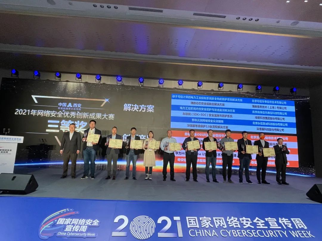 10日 “2021年网络安全优秀创新成果大赛”总决赛成功举办。现场直播共吸引了6万观众在线观看。入围总决赛的10项解决方案和10项创新产品进行了现场路演,安恒信息带来的安恒物联网安全监测平台在大赛总决赛上摘得三等奖,并在11日举行的网安周“网络安全产业发展论坛”上接受荣誉表彰。