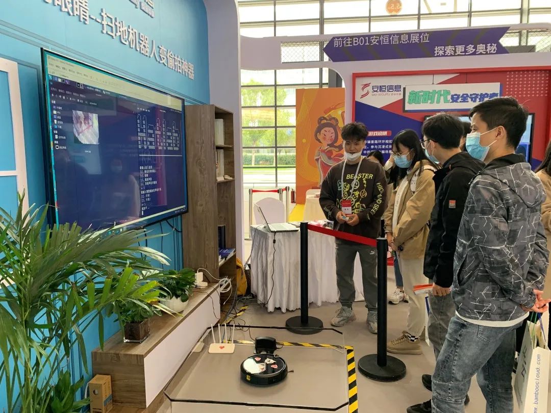 万物互联的时代,物联网产业快速发展,但安全规范还有所欠缺,诸如扫地机器人、智能音箱、智能门锁等物联网智能设备等不少物联网终端设备存在安全风险。安恒信息互动展区以市面上常见的一款扫地机器人为例,通过展示此类产品因为安全漏洞导致的录音、拍照等安全隐患,吸引了不少观众驻足感受。我们希望通过扫地机器人的演示,让老百姓们在享受万物互联带来便利的同时,也要关注安全。在购买物联网智能设备时,尽可能选择大品牌、有安全保障的产品。