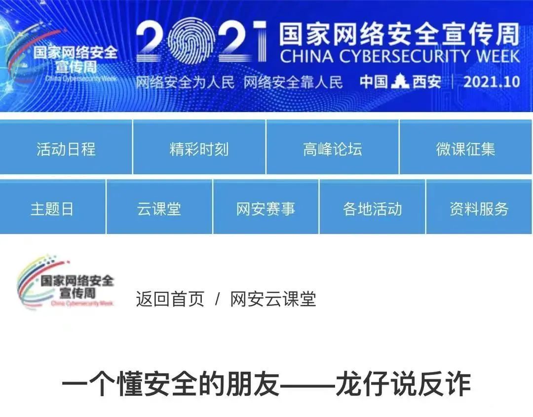 安恒信息“一个懂安全的朋友-龙仔说反诈”经过严格筛选,入选2021国家网络安全周“网络安全线上云课堂”网络安全精品课程,并在2021国家网络安全宣传周官方网站云课堂版块展示。