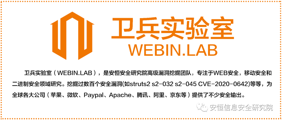 安恒信息研究院卫兵实验室是安恒信息研究院高级漏洞挖掘团队,专注于WEB安全、移动安全和二进制安全领域研究,挖掘过数百个高危安全漏洞(如struts2-032、struts2-045、CVE-2020-0642等等),为全球各大公司(苹果、微软、谷歌、Oracle、Paypal、Apache、Cisco等)提供了持续、有价值的安全信息输出。本次快速、成功的挑战就是依靠实验室团队长期积累的技术能力及强大的团队协作能力,展示出了实验室团队深厚的技术储备。