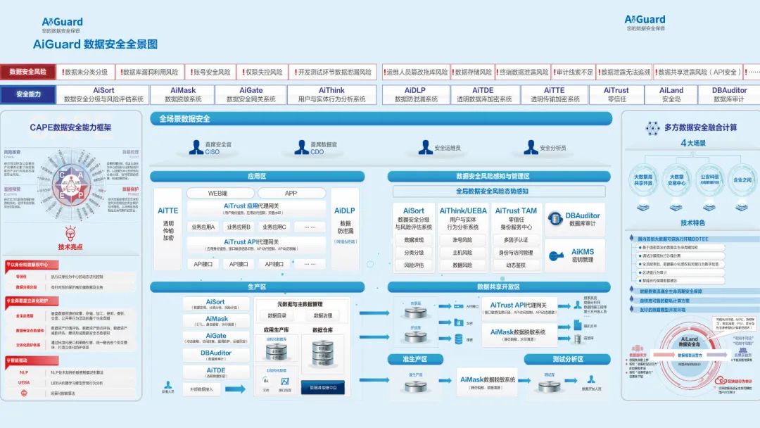 安恒信息AiGuard即实现了敏感数据安全防护的全生命周期过程全覆盖,以风险核查为起点,以数据梳理为基础,以数据保护为核心,以监控预警作为支撑,最终形成全局数据安全风险态势感知。