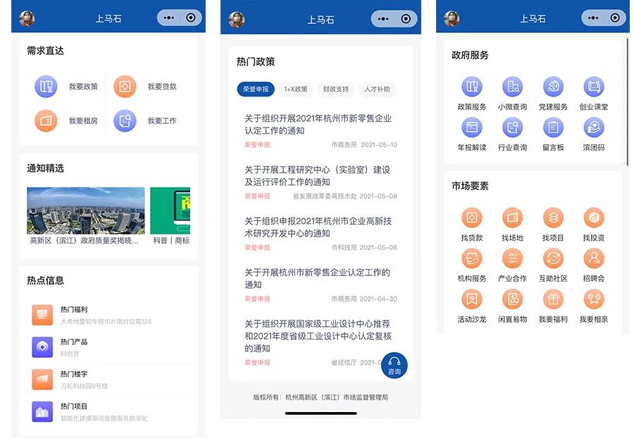 “滨江上马石”微信小程序,是杭州高新区(滨江)为区内企业打造的e服务平台,由安恒信息研发完成。平台依托城市大脑-经济主体大数据平台底座,及应用数据的支撑,以“扶上马、送一程”为目的,进一步链接政府-企业-银行-园区,营造更加良好的创新创业生态。