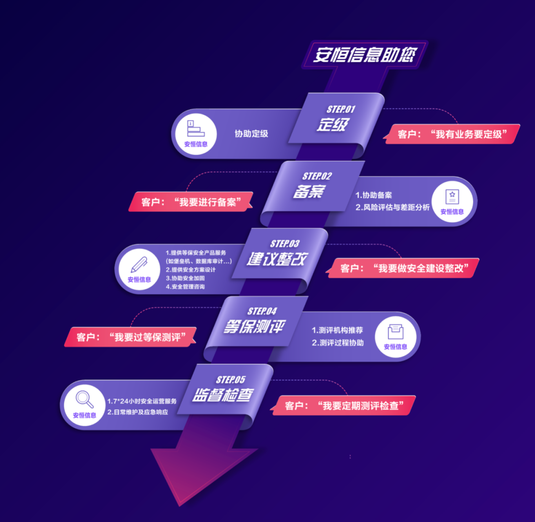 2、建议整改阶段:专家团队为用户提供安全方案设计、安全加固、安全管理咨询等服务,安恒一站式的等保套餐帮助用户快速构建安全体系。