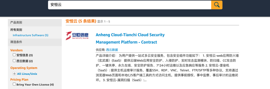 通过亚马逊市场搜索【安恒云】即可查到安恒云在线SaaS订阅服务。
