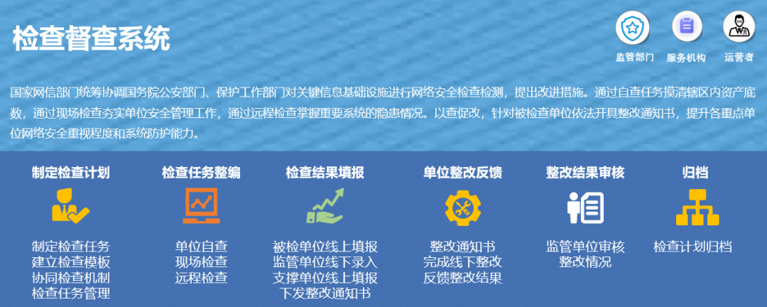 ● 响应:平台具备检查督查模块,提供现场检查和安全自查两种工作模式,实现检查任务管理、远程技术检查、现场检查操作、检查报告统计及整改建议归档等功能,达到以查代促、以查促改、以查促管、以查促防的工作目标。