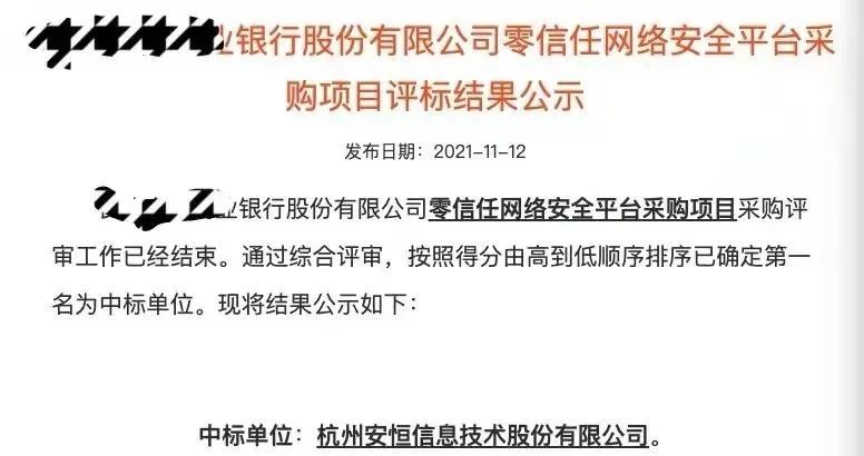 最高得分!安恒信息中标某地区银行零信任建设项目