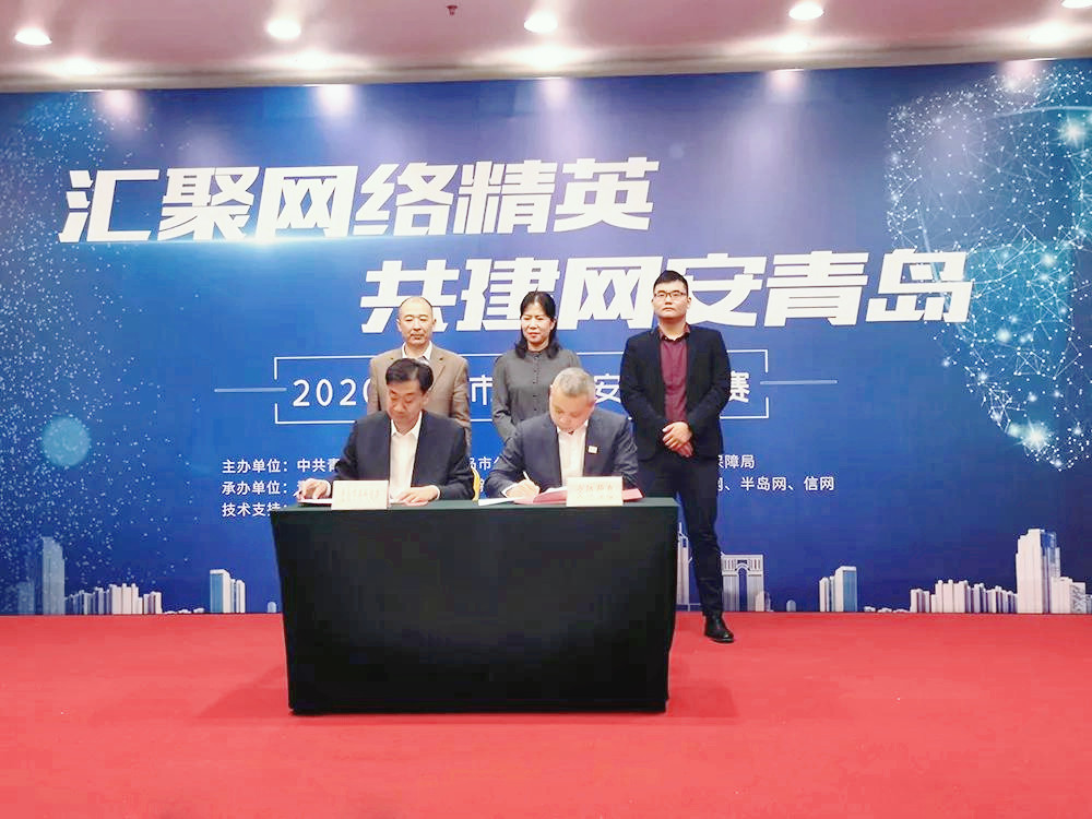 签约仪式:为进一步推进青岛市网络安全相关监管和应急工作,促进网络运营者网络安全责任落实,加强青岛市网络安全保障、网络安全产业发展,11月25日中共青岛市委网信办与安恒信息正式签署合作协议。中共青岛市委网信办副主任王军、安恒信息副总裁芦健出席会议并代表双方签署协议。