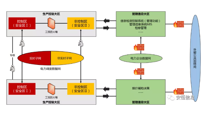 安全域是由一组具有相同安全保护需求、并相互信任的系统组成的逻辑区域,由在同一工作环境中、具有相同或相似的安全保护需求和保护策略、相互信任、相互关联或相互作用的IT要素的集合。因此电力系统可分为生产控制大区和管理信息大区: