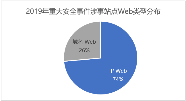 不难发现,在2019年重大安全事件涉事站点Web类型中,有74%的Web资产是通过IP直接访问的。IP Web资产通过IP+端口可以直接进行访问,绕过了云防护,这类站点更容易被黑客入侵。