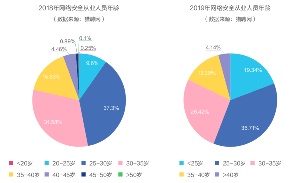 在网络安全从业人员年龄来看,网络安全从业人员的年龄最多集中在25-30岁之间,占比为36.71%,但25岁以下的网络安全从业人员相比2018年的9.6%占比显著提高,占总数的19.34%。