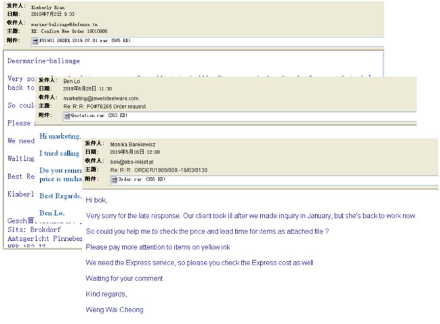 根据一些关联样本,攻击者发送的主题大多围绕ORDER、RFQ,、QUOTATION这些商贸类主题为主,附件名称也会和主题呼应。如: