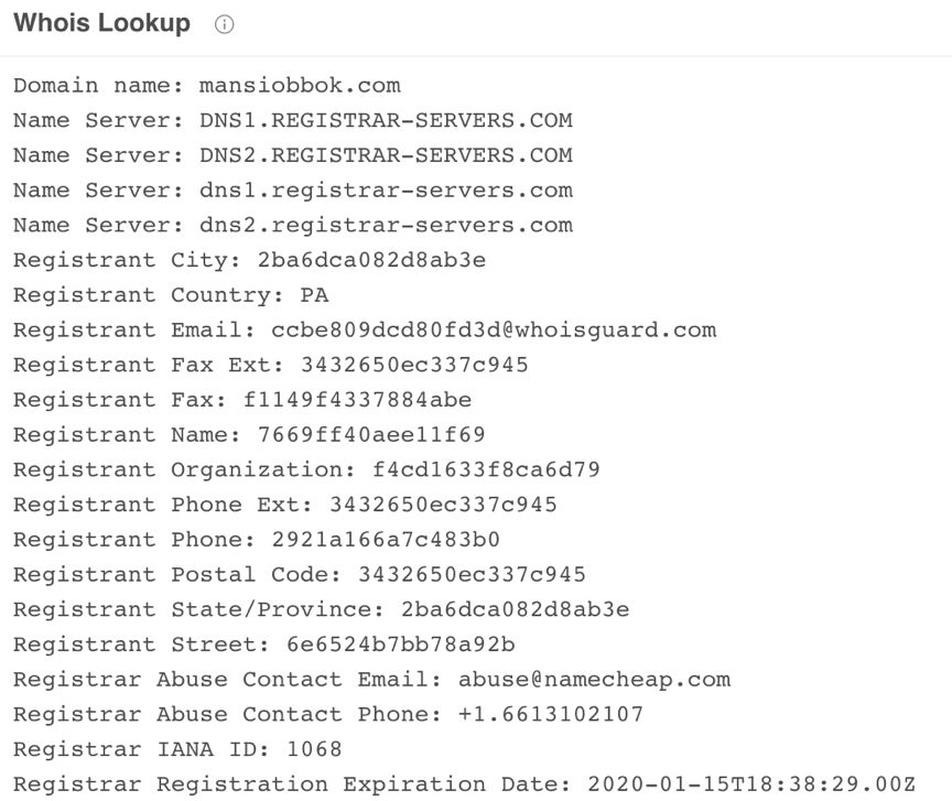 友商曾在2018年初发布过《CVE-2017-8570首次公开的野外样本及漏洞分析》一文,文中攻击组织利用CVE-2017-8570漏洞进行文件投递,投递样本使用的payload为FormBook,并且样本使用VB编写,也是解密出真正的恶意代码注入进程中执行,并且在给出的回连域名中有mansiobbok[.]com这个域名,和我们关联到的mansiobbok[.]info仅后缀不同,查询mansiobbok[.]com的whois信息,发现也是在相同地方注册的域名。