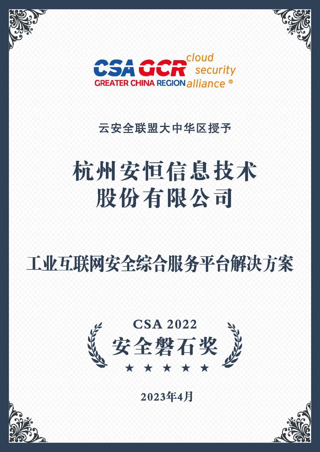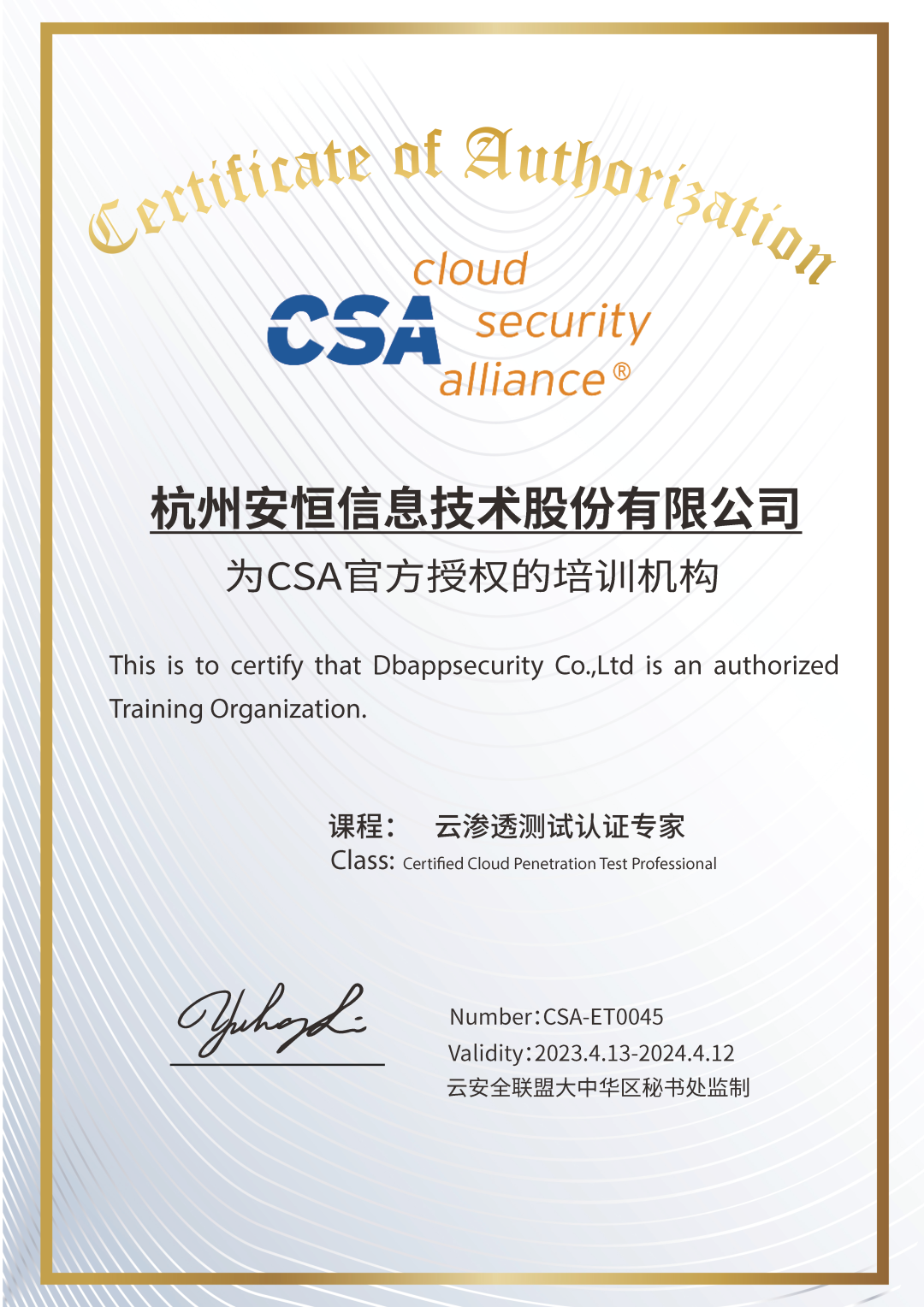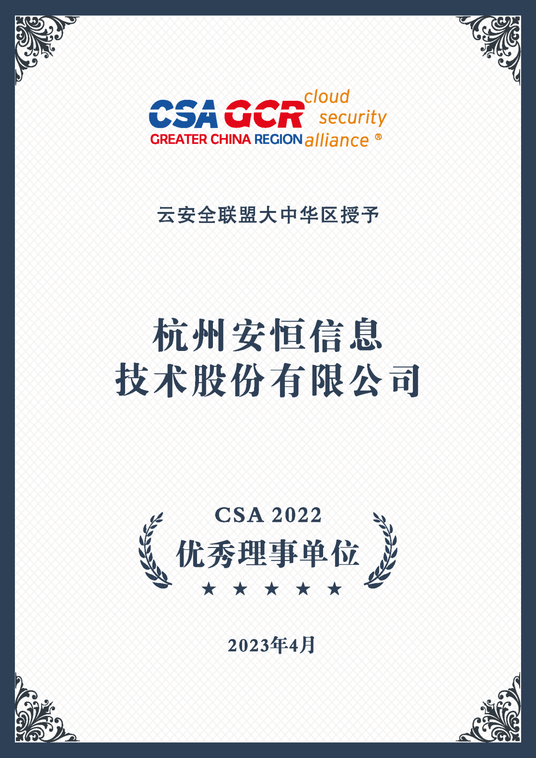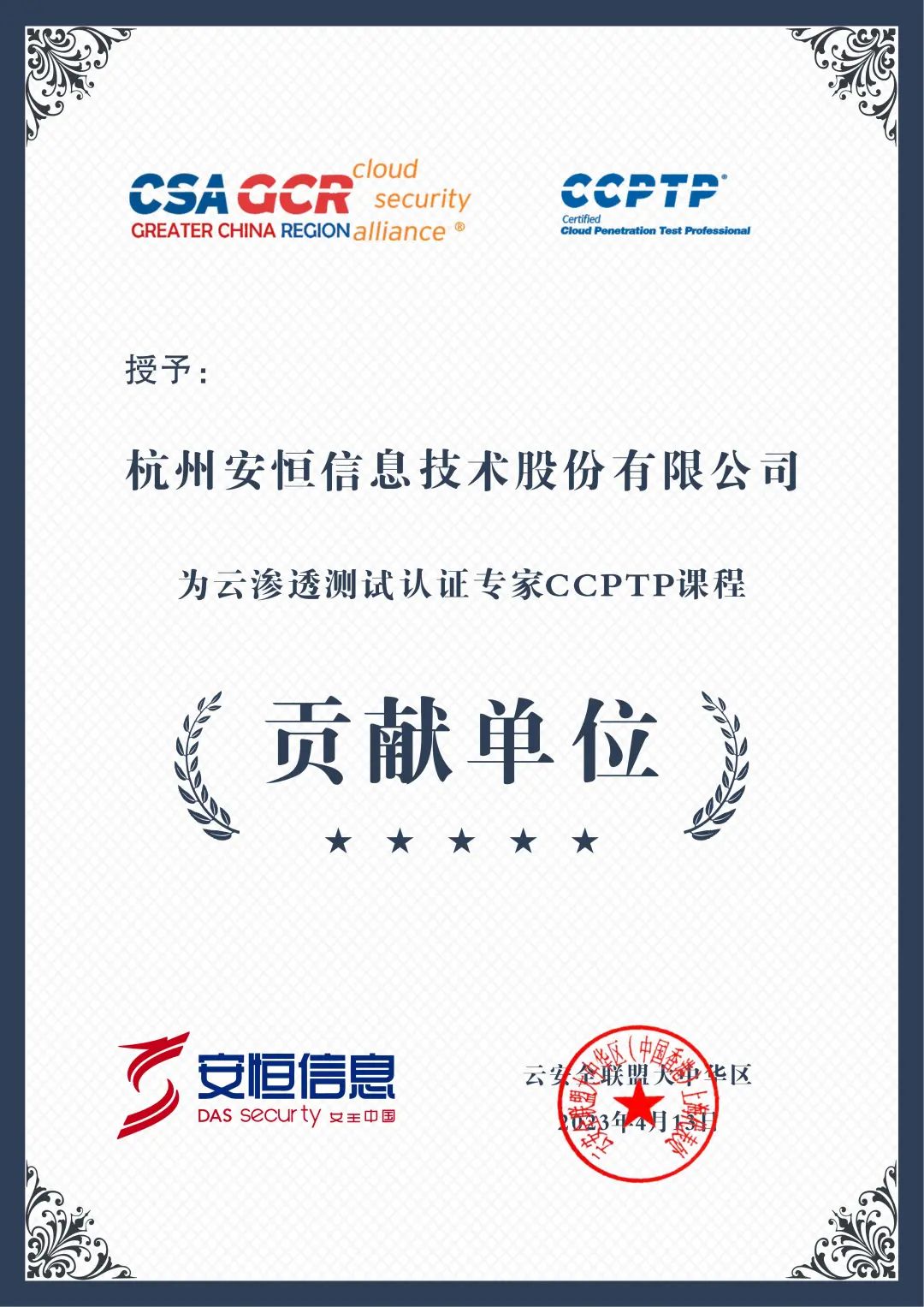 作为首批加入CSA联盟的成员单位,安恒信息荣获云安全联盟大中华区颁发的“CSA 2022 安全磐石奖”、“CSA官方授权培训机构”、“云渗透测试认证专家CCPTP课程贡献单位”以及 “CSA 2022 优秀理事单位”4项荣誉。