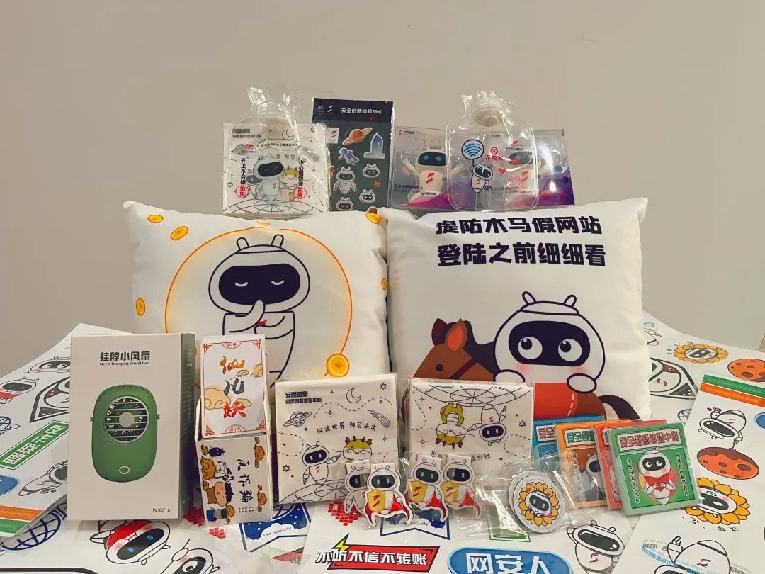 同时,创新体验中心定制各式伴手礼,如热水袋、便利贴、纸巾、扇子、反诈纸牌、行李贴等,还联合安恒信息数字人才创研院共同出品网络安全科普相关书籍。