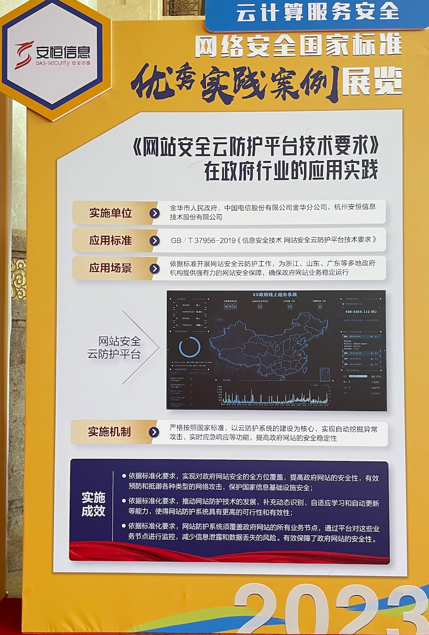 除了范渊的精彩演讲之外,同样值得一提的是,安恒信息提报的《浙江省金华市政府网站安全云防护平台实践案例》,凭借对国家标准的深刻理解和方案的可实施性,荣获网络安全国家标准优秀实践案例并作为优秀实践案例现场展览。