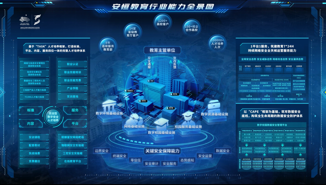 教育行业:服务14个省级教育厅、超1200所高校的信息安全建设,与全国150+高校开展校企合作,培养网络安全人才人次超10W+。