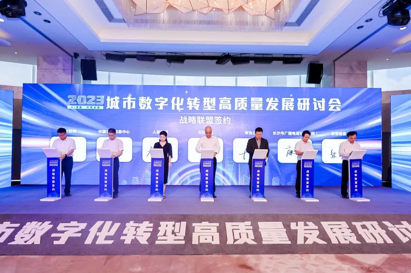 研讨会现场,万达信息党委书记、副董事长兼总裁胡宏伟,华为云全球生态部总裁康宁,人民数据副总经理杨森滟,长沙市广播电视台(集团)党委书记、台长、总编辑彭勇,中国金融信息中心党委委员、总裁张凤明,安恒信息党委书记、副董事长张小孟,格尔软件总经理叶枫进行战略联盟签约。
