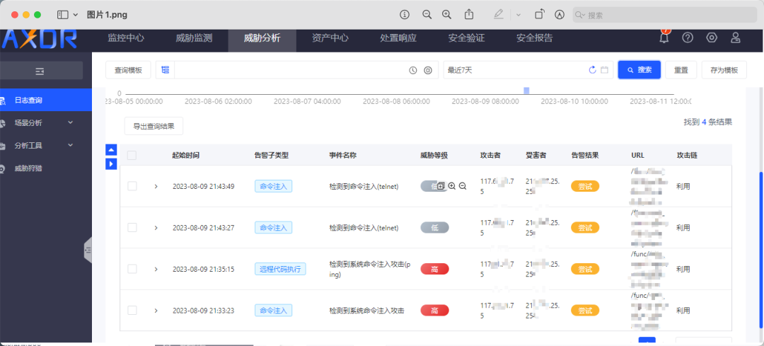 第一天就发现了0day,这问题不可谓不严重,现场立刻启动1级应急响应,用户也立刻赶到现场,紧急联系对应0day厂商进行修复。同时,通过AXDR联动用户防火墙进行快速封禁处置,防止产生更大的危害。