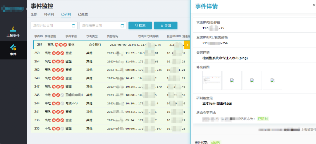 在战时,通过对全网流量、终端数据、诱捕数据等进行深度关联分析,实时动态的精准识别安全告警,并提炼出完整的安全事件。