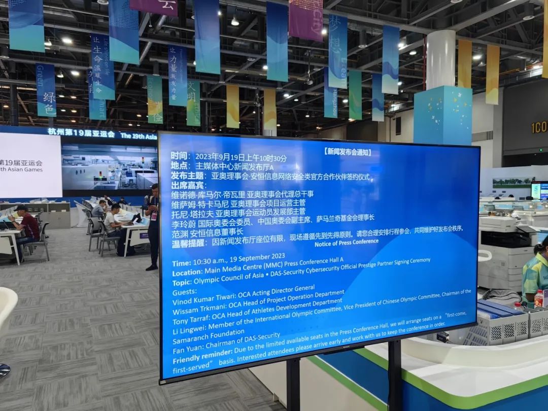9月19日,亚洲奥林匹克理事会(以下简称亚奥理事会)与安恒信息在杭州亚运会主媒体中心(MMC)完成签约,安恒信息正式成为亚奥理事会网络安全类官方合作伙伴。