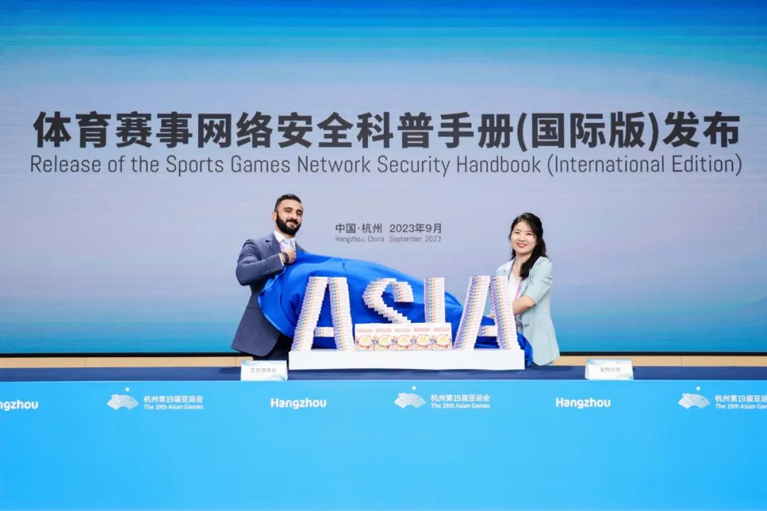 会上,《体育赛事网络安全科普手册(国际版)》首次发布,在杭州亚运会即将到来之际,为每一位运动员、工作人员和观赛观众普及网络安全知识、提升自我保护能力,保障杭州亚运会及其他亚洲体育赛事精彩、安全举办。亚奥理事会项目运营主管维萨姆·特卡马尼和安恒信息高级副总裁段平霞共同进行了发布。