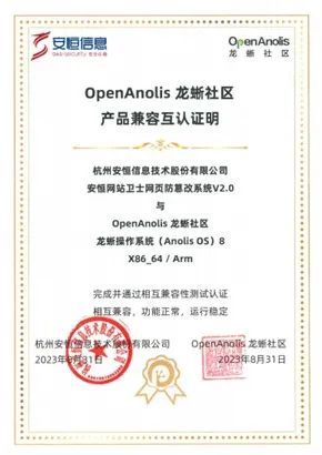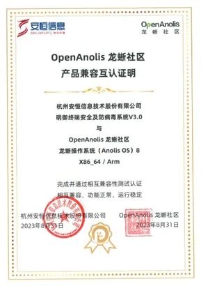 2023 年 9 月,安恒信息产品明御终端安全级防病毒系统与安恒网站卫士网页防篡改系产品完成了与龙蜥操作系统(Anolis OS)在 x86、AArch64 两个不同架构下的相互兼容性测试认证,结果显示:相互兼容,功能正常,运行稳定。