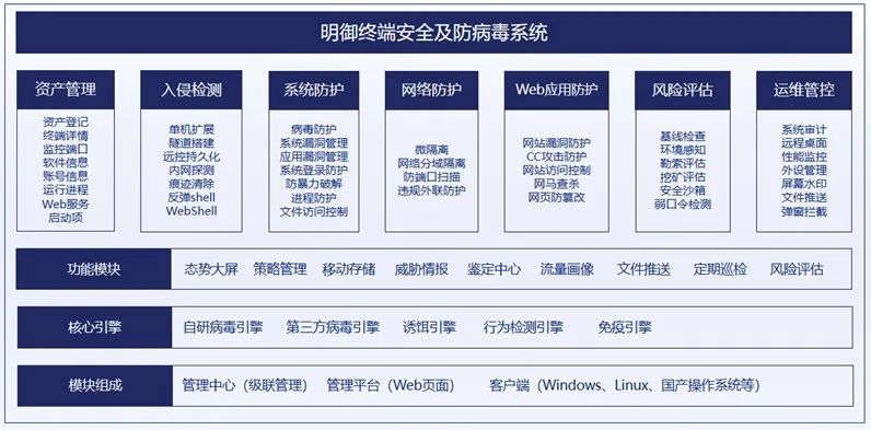 明御终端安全级防病毒系统是一款集成了丰富的系统加固与防护、网络加固与防护等功能的主机安全产品。目前该产品广泛应用在服务器、桌面PC、虚拟机、工控系统、容器安全、攻防对抗等各个场景。