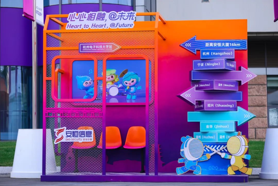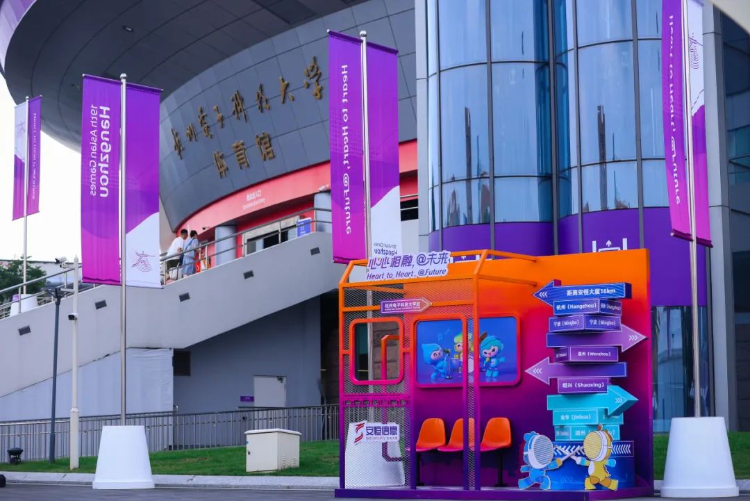 场馆位于学校教学区西区地块,距离亚运村约23KM,距离安恒大厦16KM。安恒信息在场馆门口专设了打卡拍照点,以车站为整体设计理念,设置了座椅、路标等趣味物品,让来往观赛者在此合影留念,记录与亚运的点点滴滴。